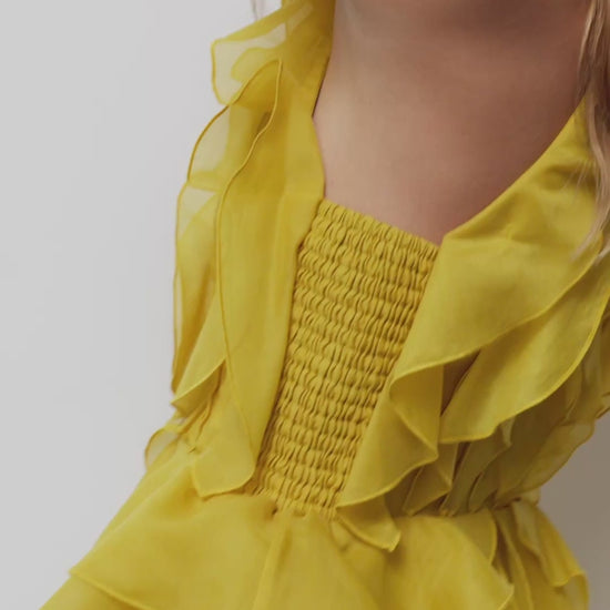 Vestido longo da marca australiana AJE. Peça tomara que caia em tom de amarelo mostarda. Vestido com decote cavado, com babados, fluido, com busto estruturado e elastico na lateral. Fecho em zíper na parte posterior.