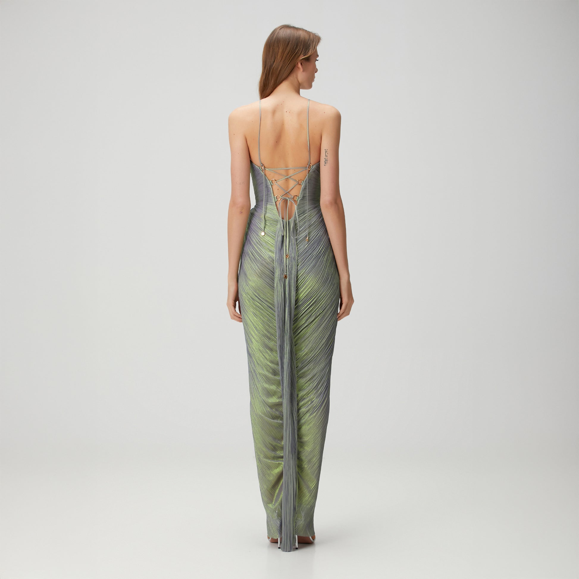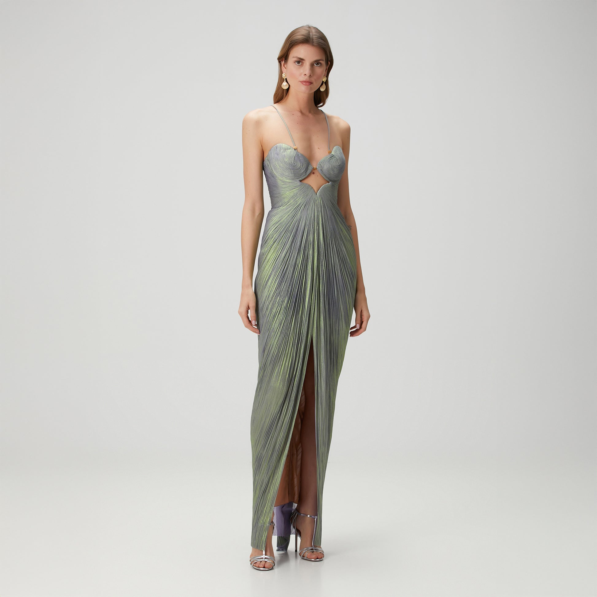Projetado para cativar, o Elsa é confeccionado em tule de seda metálico e apresenta um decote profundo com um recorte ousado que oferece um toque moderno à elegância clássica. O busto ajustado valoriza a silhueta e apresenta alças finas adornadas com pingentes metálicos dourados, e a saia flui em linha reta até o chão, criando um corpo elegante e alongado.