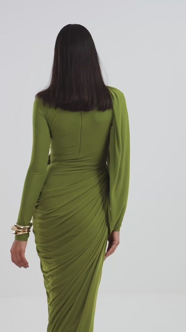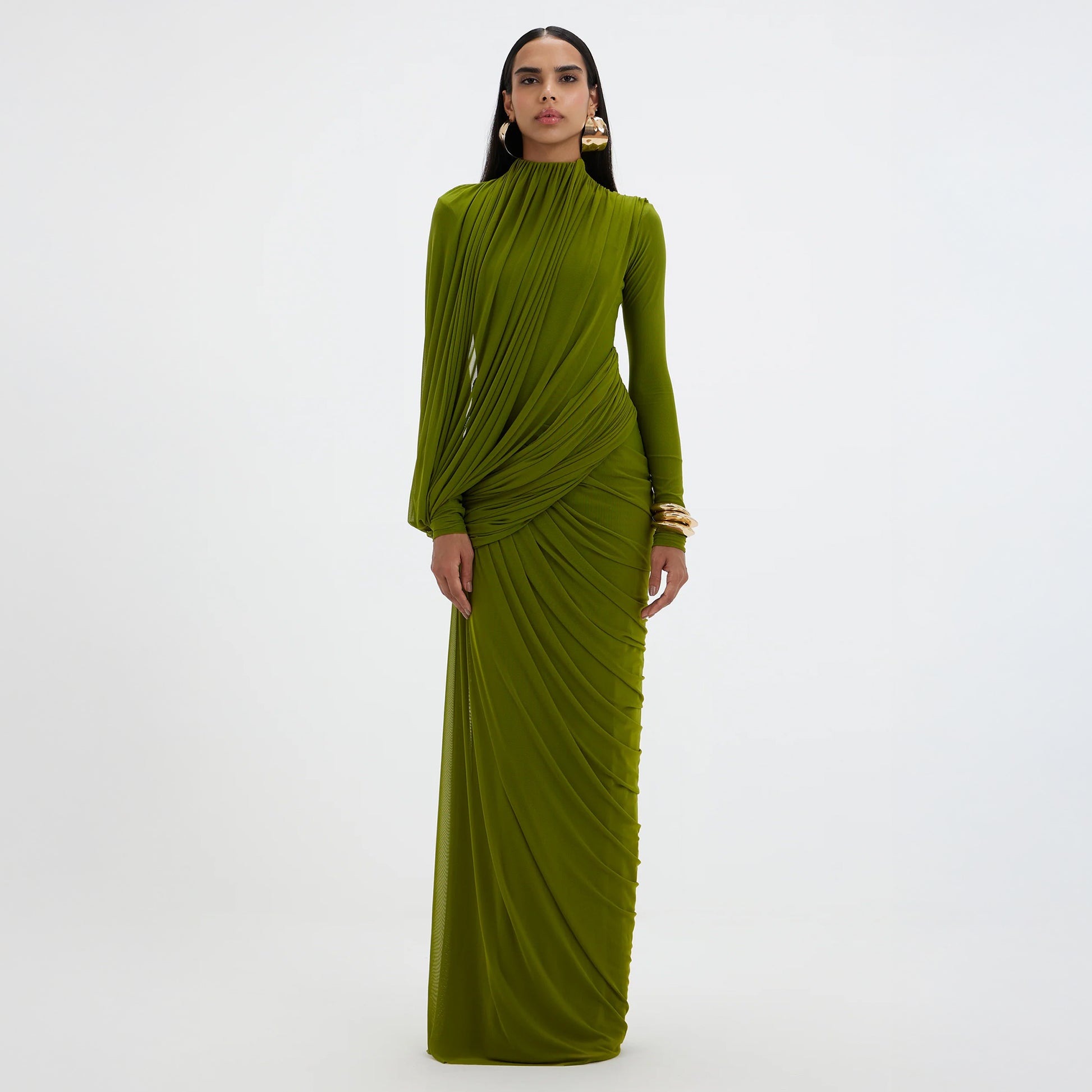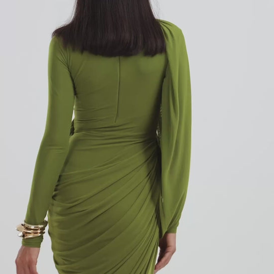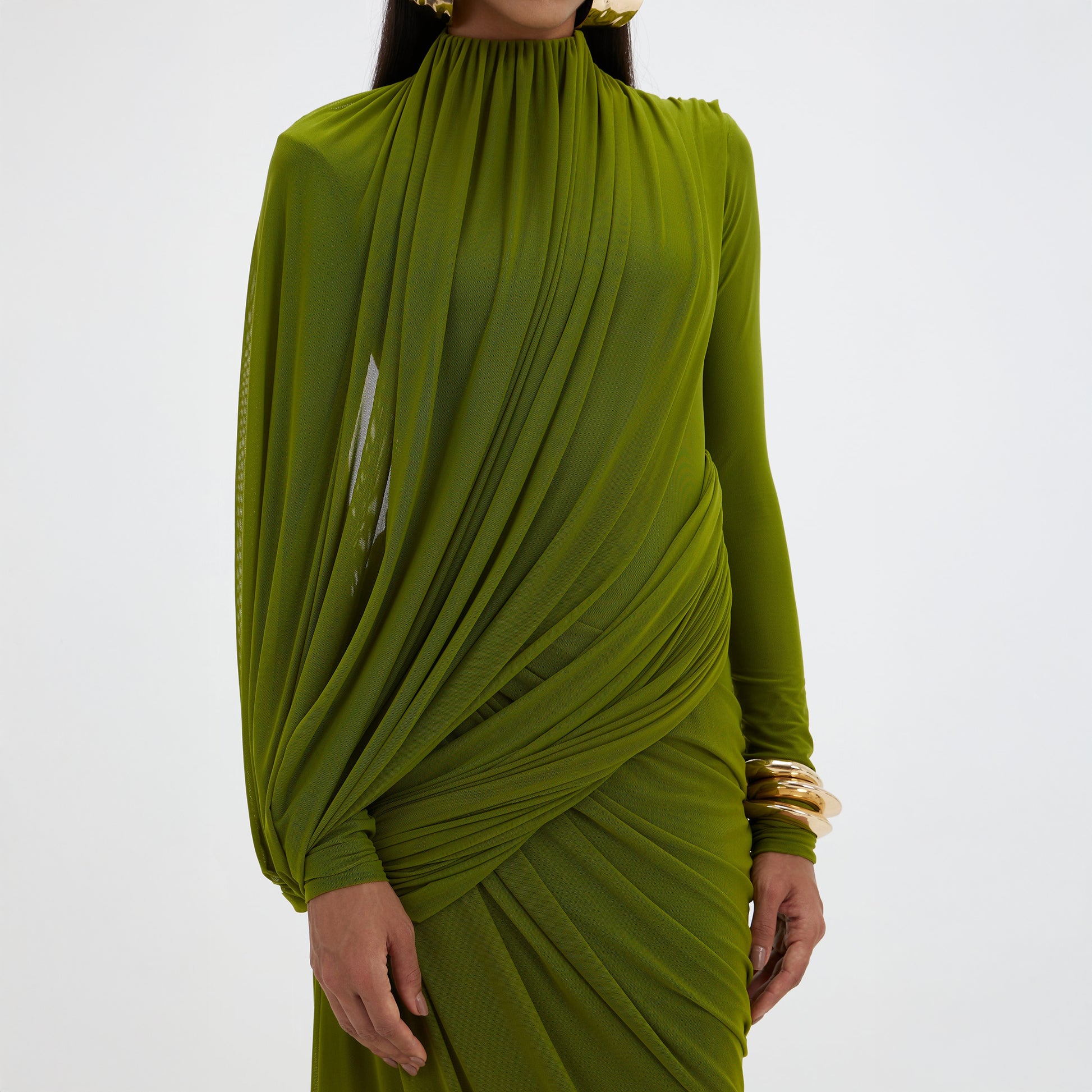 Com uma silhueta escultural em um refrescante tom de verde-limão, este vestido de gola alta apresenta mangas compridas e uma saia elegantemente drapeada que cai assimetricamente de um lado. Na parte superior, um drapeado plissado flui do decote, envolvendo o braço com elegância e fixando-se na lateral para formar uma alça suave – permitindo que a mão deslize facilmente por dentro. Uma combinação perfeita de estrutura e fluidez, este vestido redefine a elegância moderna com um toque de dramaticidade.