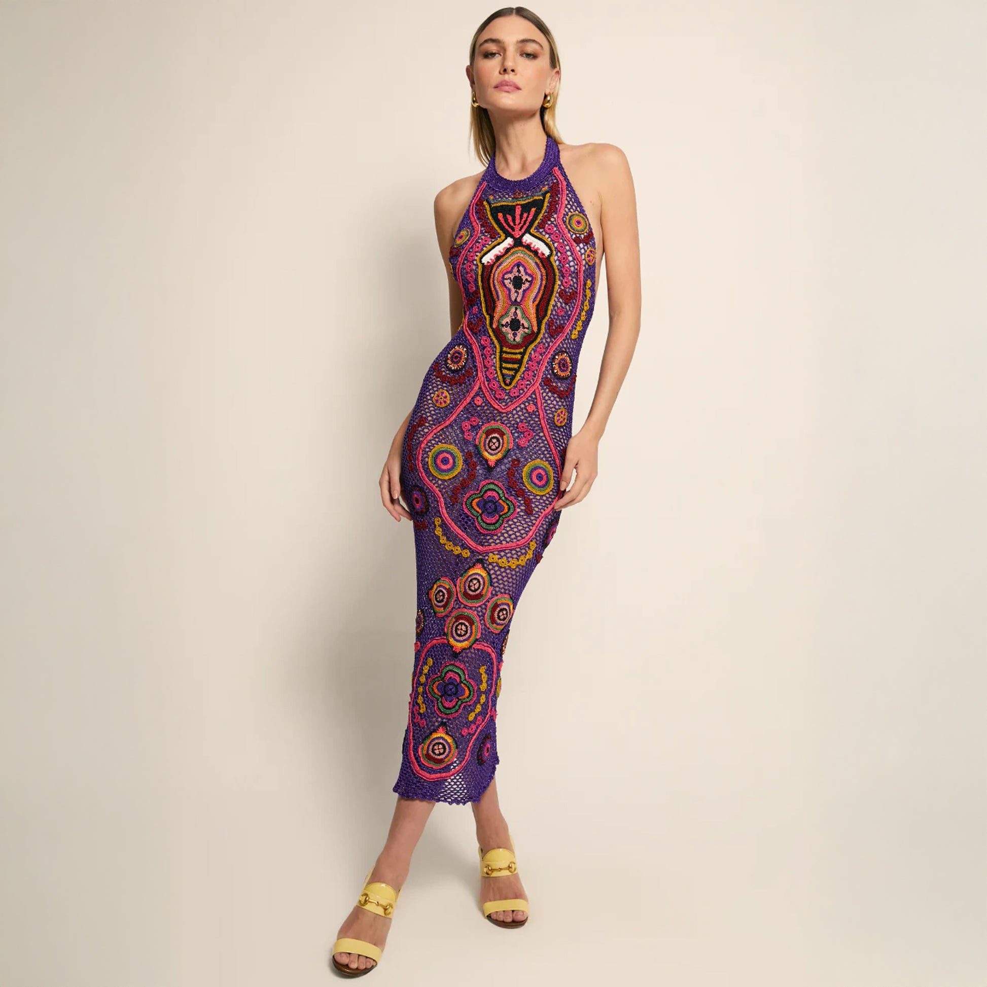 Este é um deslumbrante vestido midi com decote frente unica, feitao 100% de forma manual por artesãos locias e construida com base em principios sustentáveis.
